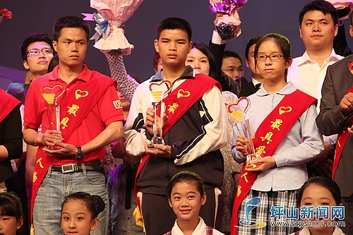 坪山中学90后初三学生罗新雄(中)当选本年度“最具爱心人物”。