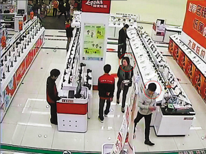当日15时许,前海路的国美电器门店,有两男一女在尼康单反相机柜台招呼女导购员咨询。他们拿起相机观看时,门口又进来3名男子,在周围转悠。一穿白衣的男子和穿黑衣的男子走到远端一侧的摄像机柜台,向女导购员佯装详细咨询,一穿灰绿色衣服男子在相对的一侧吸引住能观察到相机柜台的男导购。此时,两名导购都在同一侧,视线正好被尼康相机展台边的立柱所挡住。