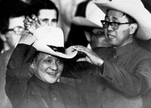 1979年初,邓小平出访美国。图为1979年2月2日,邓小平在休斯敦附近的西蒙顿小镇观看牛仔竞技表演时戴上宽边牛仔帽。