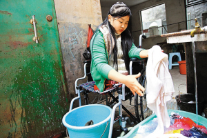 近日,冯宇坐着轮椅在为家人洗衣服。深圳商报实习记者 肖晓峰 摄