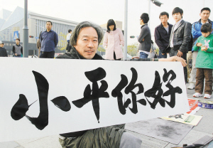 昨天,在市民中心,苗先生书写的“小平你好”表达了他的心情,也打动了市民。