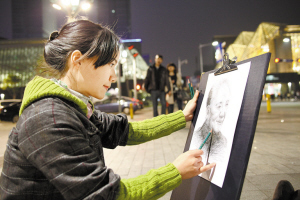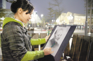 昨天晚上,中心书城前的广场上,市民小琴在画邓小平像,表达对伟人的缅怀之情。