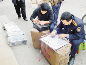 执法人员在对违规销售的商店开处罚单。
