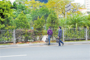 记者在丽景城小区旁边的宝安客运中心南公交站看到,公交站前面辅道的绿化带已被踩出4条小路,主道之间的护栏则被破开一个宽约3米的口子。时值下班高峰期,车流滚滚,不少市民铤而走险,趁车流量较小的间隙横穿西乡大道。记者在10分钟内,就看到近30个人从路中护栏破口横穿马路,险象环生。对此,附近居民都十分无奈。
