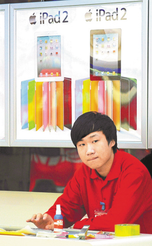 近日,沈阳一家苹果公司产品专卖店的销售人员坐在iPad 2广告招贴画前。新华社发