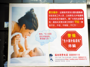 昨日上午,一条横幅挂在市妇幼保健院内院大门口,“警惕‘生小孩补贴骗钱’诈骗”。福田网警大队民警则给来来往往市民派发“特制”的宣传单。