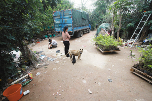记者绕过紧锁的铁门,从另一侧未封锁的缝隙才得以进入公园,只见公园内杂草丛生,并无建筑材料堆放,还有阵阵恶臭从一旁无人管理的水沟传来。园内有一间废弃的木屋,屋外散落着塑料桶和塑料等废品。一辆大货车停在公园里,揭开货车的帆布,可以看见里面装的都是旧书纸皮和废铁,但是现场的3男1女都否认是在做收购废品的交易。