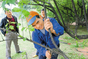 当记者问这是什么树时,他们一会儿说是“桃驳李”,一会儿又说是“李子树”。“我们这是在剪阴枝,是为了让这些树长得更好。”自称是中心公园管理处工作人员的莫先生介绍说,这里有二三十棵类似的树,树越长越密,为了让树通风,就进行了修剪。