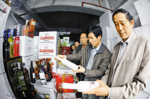 市场监管部门执法人员查处涉嫌侵权假冒的洋酒。深圳商报记者 肖 健 摄
