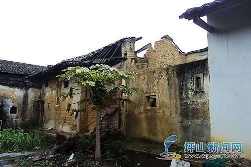 在世居的第二排房子前,记者看到,好几处墙壁上都用红色大字写着“危房,请勿靠近”的字眼。黄氏宗祠的左右两边墙体都不同程度受损,左边一处房檐有一半向下倾斜,拱形大门已经被砖瓦砌上封住,还有一根粗重的木头抵住门墙。右侧的房子基本全部倒塌,只剩下断壁残垣,所有的门已经被砖块封死。