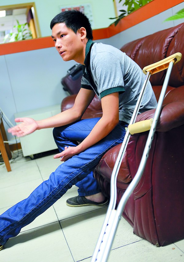 13日,小曹在朋友的陪同下拄着拐杖来到晶报社,投诉3个多月前他被石岩派出所的一名联防队员孙某踢伤,至今仍未痊愈的事情。双方由于赔偿谈不妥他手术也无法做。记者了解到,目前孙某已被石岩派出所控制。