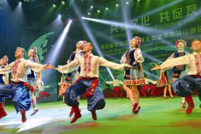 当晚演出最卖力的要数乌克兰Barvinok舞团,他们带来了传统舞蹈《戈帕克》、打击乐演奏《哥萨心灵之乐》、滑稽舞蹈《甘迪亚》等5个充满民族风情、搞笑元素的舞蹈节目,让新区观众大饱眼福。此外,坪山高级中学的舞龙表演让外国客人们看得如痴如醉,他们纷纷竖起大拇指,用“夹生”的中文说道:“中国传统节目很好看”。(图为乌克兰Barvinok舞团表演传统乌克兰舞蹈。