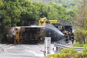 3月4日清晨6时许,在坪山新区比亚迪路与葵坪路交会处发生一起车祸,一辆装载24吨的石油液化气槽罐车在拐弯中发生侧翻,车上的石油液化气发生少量泄漏,车上两名男子受伤入院治疗。当地公安部门、消防部门以及燃气公司出动百余工作人员紧急处理。坪山新区党工委书记杨绪松也前往现场指导处置工作。