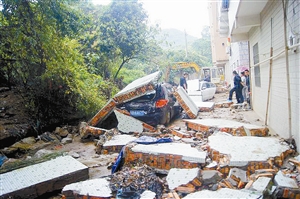 (见习记者 叶萌文/图)3月31日早晨,瓢泼大雨中,宝安区石岩街道应人石新村内一排围墙突然倒塌,停在墙边的6辆车被砸毁。
