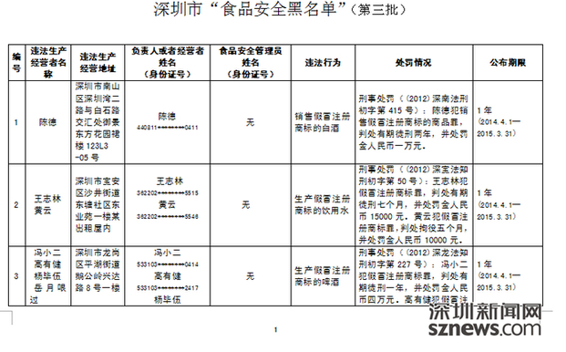 4月1日,市食安局发布了深圳市第三批“食品安全黑名单”。
