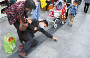 新安街道义工街头演绎“快闪”,为扶人市民送鲜花,以此宣传扶人助人。深圳报业集团资料图片