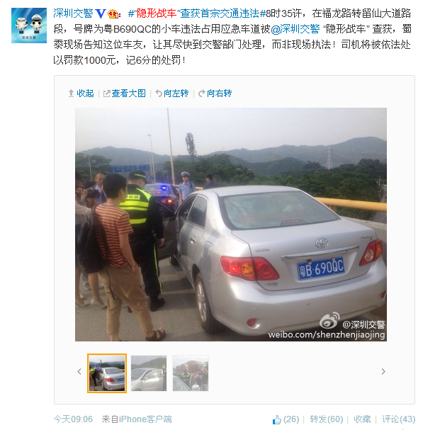据了解,深圳首批推出“隐形战车”10辆,随着“法治通城行动”深入开展,还将继续推出。据“@深圳交警”统计,“隐形战车”在昨天上午共抓了8单严重违法行为。