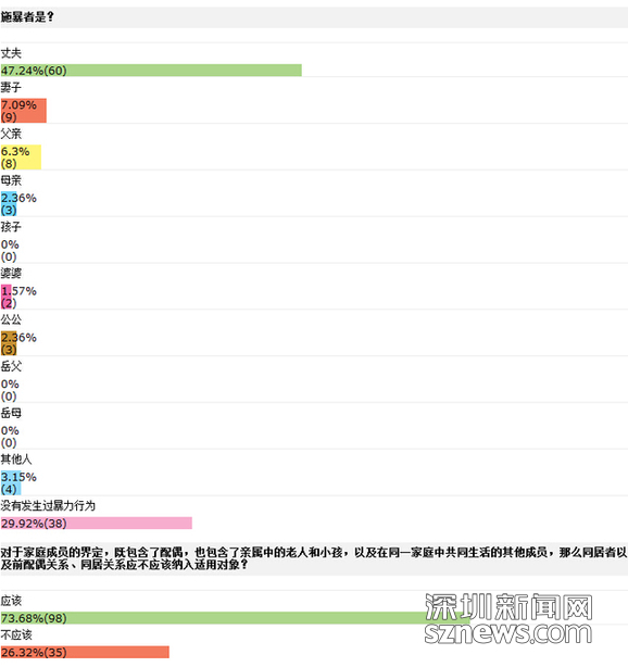 圳调查结果显示,家庭暴力者中,丈夫所占比重最大,近5成参与调查者透露施暴者为丈夫