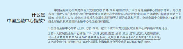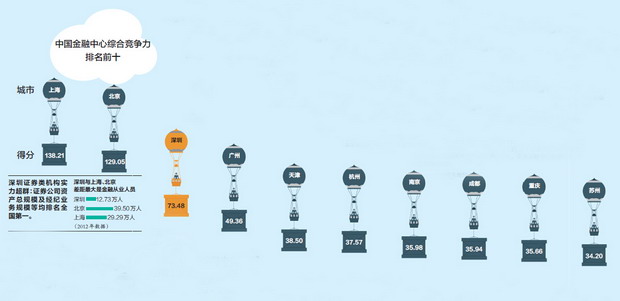 昨天下午,综合开发研究院(中国·深圳)发布第六期“中国金融中心指数”(CDI·CFCI 6)显示,国内综合竞争力排名前十名的金融中心依次为上海、北京、深圳、广州、天津、杭州、南京、成都、重庆、苏州。深圳位居第三,但在金融产业绩效、金融机构实力和金融生态环境等方面,均落后于上海和北京,差距最大的是金融从业人员。