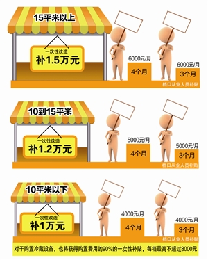 按规定,试点活禽销售档、活禽宰杀档、生禽销售档按照标准完成原档口升级,并且验收合格后,按照档口的营业面积都将获得一次性的改造补贴。对于试点档口的从业人员,也将在下列两种情况中选取一种进行补贴:一类是不再进行家禽销售的档口,另一类是继续经营生鲜家禽档口的从业人员。