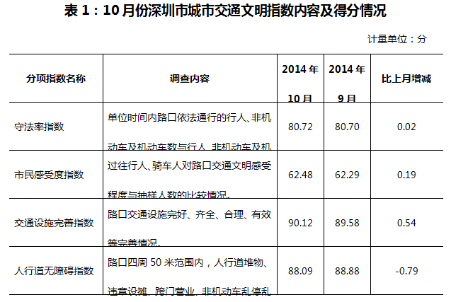 表1:10月份深圳市城市交通文明指数内容及得分情况