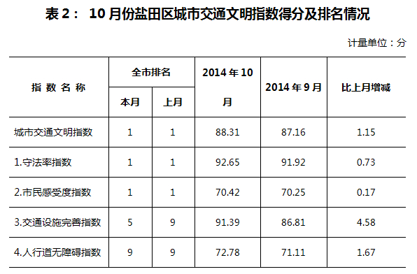 与9月份对比,盐田区城市交通文明指数增加1.15分,四项分项指数均有不同程度上升,其中守法率指数和交通设施完善指数均达到监测以来最高分。主要原因:一是各监测点交通管理人员积极维护交通秩序,有效劝阻行人、非机动车闯红灯等行为,守法率指数因此上升0.73分;二是部分监测点过往市民对交通文明满意度评价有所上升,市民感受度指数因此上升0.17分;三是北山永安路口等监测点行人信号灯缺失等现象得到完善,交通设施完善指数因此上升4.58分;四是部分监测点机动车、非机动车乱停放现象有所减少,人行道无障碍指数因此上升1.67分。具体排名及与上月对比情况(见表2)。