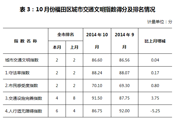 与9月份对比,福田区城市交通文明指数增加0.04分,分项指数呈现“三升一降”的现象。除人行道无障碍指数外,守法率指数、市民感受度指数、交通设施完善指数均有不同程度上升,主要原因:一是笋岗东路上步中路路口、深南大道红树林路口和红荔路华富路路口等多个监测点交通管理人员进行有效劝导,行人、非机动车闯红灯现象有所减少,守法率指数因此上升0.17分;二是部分监测点过往市民对交通文明满意度评价有所上升,市民感受度指数因此上升0.80分;三是部分监测点交通标志缺失等现象有所减少,交通设施完善指数因此上升了3.75分。但由于部分监测点非机动车乱停放、跨门营业、堆物等现象有所增加,人行道无障碍指数大幅下降5.25分,连续三个月呈下降态势。具体排名及与上月对比情况(见表3)。
