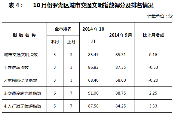 与9月份对比,罗湖区城市交通文明指数增加0.16分,分项指数呈现“二升二降”的现象。由于本月部分监测点隔离设施不完善的问题得到改善,交通设施完善指数因此上升2.25分。同时,部分监测点非机动车乱停放现象有所减少,人行道无障碍指数上升了3.33分。但由于嘉宾路东门南路口等监测点非机动车通行量增加,存在非机动车闯红灯和行走在机动车道的现象,且个别监测点交通管理人员工作不积极,行人闯红灯现象有所增加,守法率指数因此下降0.53分。此外,受部分监测点过往市民对交通文明满意度评价下降的影响,市民感受度指数下降0.20分。具体排名及与上月对比情况(见表4)。