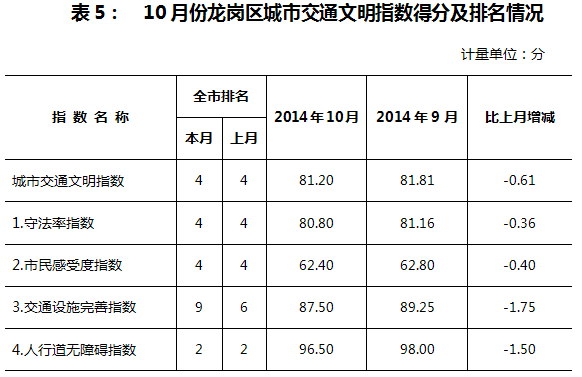 与9月份对比,龙岗区城市交通文明指数减少0.61分,四项分项指数均有不同程度下降。主要原因:一是贝尔路坂雪岗大道路口等多个监测点行人通行量有所增加的同时,监测点现场交通管理人员有所减少,行人闯红灯现象有所增加,守法率指数因此下降0.36分;二是受部分监测点过往市民对交通文明满意度评价下降的影响,市民感受度指数下降0.40分;三是部分监测点交通标志缺失及交通标线不清晰现象有所增加,交通设施完善指数因此下降1.75分;四是部分监测点跨门营业、非机动车乱停放等现象增多,人行道无障碍指数因此下降1.50分。具体排名及与上月对比情况(见表5)。