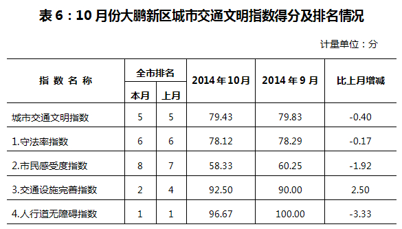 与9月份对比,大鹏新区城市交通文明指数减少0.40分,各分项指数呈现“一升三降”的现象。由于部分监测点交通标线不清晰等现象有所减少,交通设施完善指数因此上升2.50分。其他三项分项指数下降主要原因:一是金业路延安路口本月机动车通行量下降,行人在无机动车通行时闯红灯现象有所增加,同时,金葵路金业路口存在非机动车行走在机动车道的现象,守法率指数因此下降0.17分;二是受过往市民对交通文明满意度评价下降的影响,市民感受度指数因此下降1.92分;三是部分监测点违章设摊、非机动乱停放现象有所增加,人行道无障碍指数因此下降3.33分。具体排名及与上月对比情况(见表6)。
