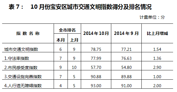与9月份对比,宝安区城市交通文明指数增加1.54分,四项分项指数均有不同程度上升。主要原因:一是本月部分监测点如宝安大道松明大道路口、翠岗西路立新南路路口、宝田一路宝民二路路口等监测点行人、非机动车闯红灯现有所减少,守法率指数因此上升了1.36分;二是部分监测点过往市民对交通文明满意度评价上升,市民感受度指数上升了2.90分;三是个别监测点信号灯故障问题得到修复,交通设施完善指数因此上升1.00分;四是部分监测点跨门营业、机动车乱停放现象有所减少,人行道无障碍指数因此上升2.00分。具体排名及与上月对比情况(见表7)。
