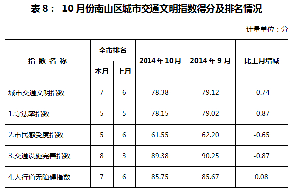 与9月份对比,南山区城市交通文明指数减少0.74分,各分项指数呈现“一升三降”的现象。由于部分监测点堆物、机动车及非机动车乱停放现象均有所减少,人行道无障碍指数上升了0.08分。但守法率指数、市民感受度指数和交通设施完善指数均出现不同程度下降,主要原因:一是多个监测点行人、非机动车通过数量增加,特别是南山大道学府路口和登良路南光路路口等监测点行人、非机动车通行量大,违规闯红灯人数较多,守法率指数因此下降0.87分;二是受部分监测点过往市民对交通文明满意度评价下降的影响,市民感受度指数下降0.65分;三是海德二道文心二路路口监测点信号灯出现故障,交通设施完善指数因此下降0.87分。具体排名及与上月对比情况(见表8)。