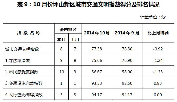 与9月份对比,坪山新区城市交通文明指数减少0.92分,四项分项指数呈现“一升二降一持平”的现象。本月部分监测点交通标志缺失现象有所减少,交通设施完善指数上升了0.83分。但是,由于金碧东纵路口出现交通堵塞,东纵路金山路路口通行人流量、车流量增加,行人、非机动车闯红灯现象有所增加,守法率指数下降了1.24分,同时,受部分监测点过往市民对交通文明满意度评价下降的影响,市民感受度指数下降了1.33分。具体排名及与上月对比情况(见表9)。
