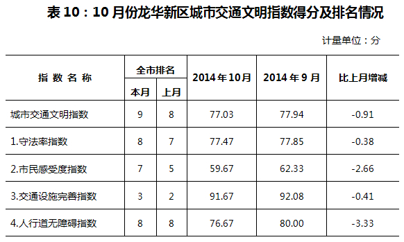 与9月份对比,龙华新区城市交通文明指数减少0.91分,四项分项指数均有不同程度下降。主要原因:一是部分监测点交通管理人员有所减少,行人、非机动车闯红灯现象有所增加,守法率指数因此下降0.38分;二是受部分监测点过往市民对交通文明满意度评价下降的影响,市民感受度指数下降2.66分;三是部分监测点交通标线不清晰现象有所增加,交通设施完善指数下降了0.41分;四是民康路民治大道等监测点非机动车乱停放现象有所增加,人行道无障碍指数因此下降3.33分。具体排名及与上月对比情况(见表10)。