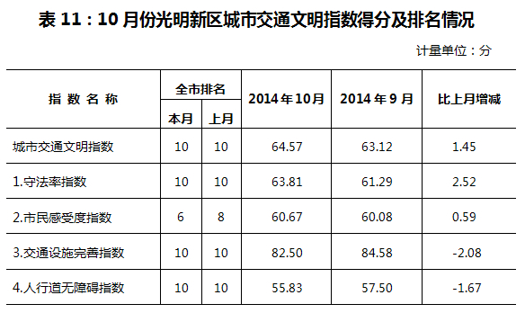 与9月份对比,光明新区城市交通文明指数增加1.45分,四项分项指数呈现“二升二降”的现象。由于松白路南环大道路口和光明大道光明大街路口等监测点交通管理人员积极维护交通秩序,行人、非机动车闯红灯现象有所减少,且个别监测点机动车违法数有所减少,守法率指数上升了2.52分。同时,由于部分监测点过往市民对交通文明满意度评价上升,市民感受度指数上升了0.59分。但交通设施完善指数和人行道无障碍指数均出现下降,分别下降了2.08分、1.67分,交通设施完善指数下降的原因是部分监测点交通标志缺失及交通标线不清晰现象有所增加。人行道无障碍指数下降的原因是部分监测点人行道堆物、跨门营业、非机动车及机动车乱停放现象有所增加。具体排名及与上月对比情况(见表11)。