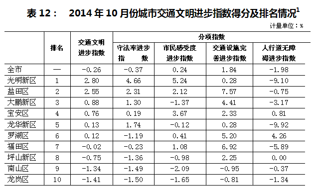三、全市及各区进步指数情况 10月份深圳市城市交通文明进步指数为-0.26%,比上月上升0.24个百分点。各分项指数中市民感受度指数、交通设施完善指数有所进步,进步指数分别为0.24%、1.84%;守法率指数、人行道无障碍指数均出现退步,进步指数分别为-0.37%、-1.98%。