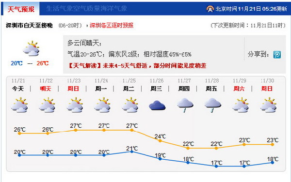 进入11月后灰霾明显增多,连续几日的灰霾给深圳上空蒙上了一层纱,昨日我市大部分地区出现轻微至轻度灰霾,能见度在4~9公里左右。预计未来一周能见度逐渐转差,部分时间有轻微到轻度灰霾,26日起新一股冷空气影响,气温再次下降,能见度有所好转。