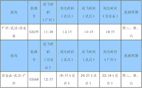 据悉,新开通的广州-武汉-旧金山航线去程航班号CZ659,由波音公司787飞机执飞,飞行时间大约为17小时。航班每周2、4、6上午北京时间11:30从广州起飞,13:15到达武汉,14:15从武汉起飞,于当地时间10:55到达旧金山;回程航班号CZ660,每周2、4、6当地时间中午12:55从旧金山起飞,北京时间第二天18:55到达武汉,20:25从武汉起飞,22:10到达广州(以上均为当地时间)。