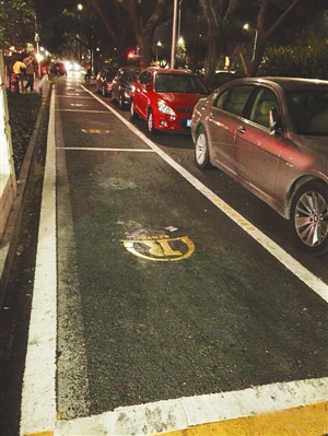 新划好的路边泊位没有车辆停放,而泊位外齐刷刷停放着一排车辆。(图片来源于深圳商报微博)