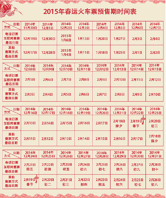 据中国铁路总公司发出公告,铁路互联网售票、电话订票的预售期将由20天延长至60天。12月1日预售期由现行20天延长至30天;12月2日至12月6日,预售期每天再比上一日延长6天,逐步延长至60天。车站窗口等其他售票方式仍按错后两天的原则同步执行。