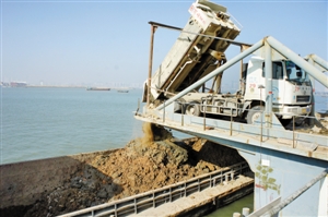 11月27日上午10时40分,记者在前海临时码头看到,满载着业内俗称为“龟苓膏”的淤泥,数辆泥头车正井然有序地排队,等待把这些淤泥直接倒入停泊在港口的船中。这些3000吨位的船装满后,将行驶到珠海横琴、中山或者广州番禺,那里有填海造陆工程正亟须土方。
