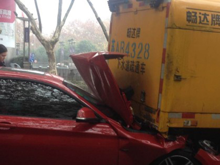 据江苏电视台新闻中心官方微博消息,今天9:20左右,南京中山北路紫峰大厦门口发生一起汽车追尾事故,一辆红色宝马跑车直接钻进了前方一辆汽车尾部,引擎盖被完全掀起。幸运的是女驾驶员丝毫未受伤,下车之后她说没有看到前方车辆的原因是自己开车睡着了。