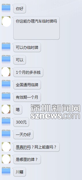 网友“SD”向深圳新闻网直播车值班QQ(1487054986)称,“还是和限购有关系的。你可以随便加几个限购的群,里面现在好多卖临时车牌的,价格从300-1500元,一个月都能出省的。突然冒出好多买临时牌的,不过都是外地的临时(牌),有川,湘,广州的……”