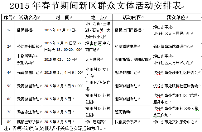 深圳新闻网坪山讯(记者 郑则彬 通讯员 黄喜标)强身健体不停止,文体娱乐不放假,为营造浓郁的节日氛围,进一步丰富新区广大市民群众的文化体育生活,2015年春节期间,新区公共事业局将推出一系列文体惠民活动,让更多企事业青工、社区居民参与到各类文体活动中来,过个健康、快乐、休闲的大年。