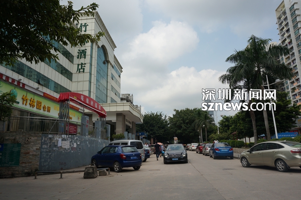 上图为2014年9月4日,竹林酒店门口道路两边停满小汽车