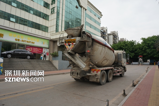 下图为2015年3月31日,竹林酒店门口一辆过路的混凝土搅拌车,无乱停车
