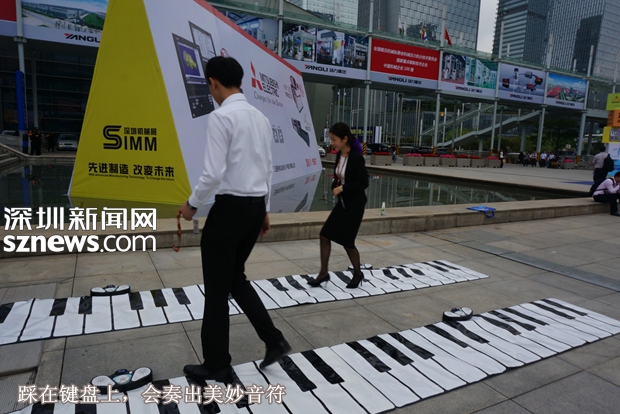 深圳机械展的会展中心正门,趣味的键盘让入场参观者忍不住踩踩看