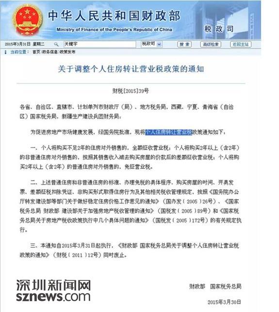 深圳新闻网3月31日讯(记者 张钊)3月30日下午,国家财政部发布了《关于调整个人住房转让营业税政策的通知》,《通知》规定个人将购买2年以上(含2年)的普通住房对外销售的,免征营业税。