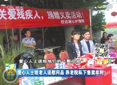 深圳市任达养老院的部分老人日前反映,爱心人士送来的牛奶、水果等慰问品从来没有分发到自己手上。媒体调查发现,该养老院竟将慰问品摆到养老院附近售卖,养老集团一位负责人对此也予以承认。3月31日,深圳市民政局官员称,养老院私卖慰问品,不管是从情感上还是从法律上,都是不允许的,已严厉批评了养老院负责人。