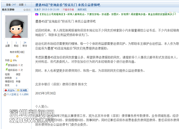 律师陈东文在深圳论坛发帖,表示将为遭遇“4S店坐地起价”网友们免费提供法律援助。